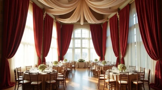 Les drapés de plafond constituent l’intervention textile la plus spectaculaire. En abaissant visuellement un plafond trop haut, ils transforment une salle froide en cocon enveloppant. Pour une salle de 150 m² avec une hauteur sous plafond de 4 mètres, comptez environ 200 à 250 mètres linéaires de voile pour obtenir un drapé généreux avec l’effet « ciel étoilé » recherché.