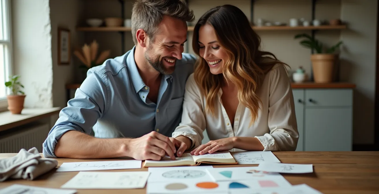 La création de cette vision n’est pas un concept abstrait. Elle peut se matérialiser par un « mood board » (tableau d’inspiration) qui va au-delà des simples images. Il s’agit de collecter des textures, des mots, des ambiances qui traduisent l’émotion que vous souhaitez créer. L’illustration ci-dessous montre parfaitement ce processus de co-création, où le couple définit son univers avant de le soumettre au monde extérieur.